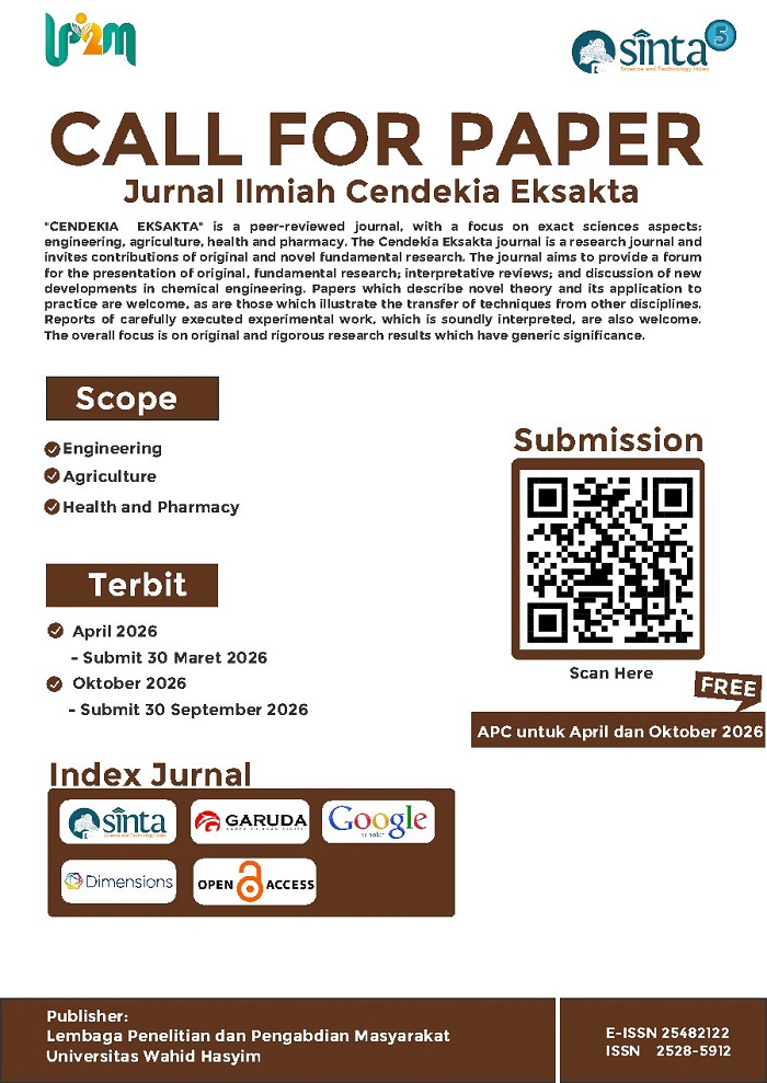 "CENDEKIA EKSAKTA" is a peer-reviewed journal, with a focus on exact sciences aspects: engineering, agriculture, health and pharmacy. The Cendekia Eksakta journal is a research journal and invites contributions of original and novel fundamental research. The journal aims to provide a forum for the presentation of original, fundamental research; interpretative reviews; and discussion of new developments in chemical engineering. Papers which describe novel theory and its application to practice are welcome, as are those which illustrate the transfer of techniques from other disciplines. Reports of carefully executed experimental work, which is soundly interpreted, are also welcome. The overall focus is on original and rigorous research results which have generic significance.