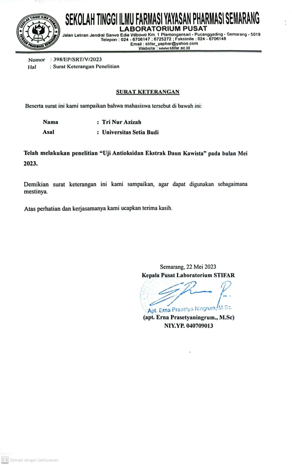Antioksidan alami (berasal dari bahan alami / tanaman) dijadikan alternatif akibat adanya kekhawatiran akan kemungkinan efek samping dari antioksidan sintetik. Salah satu tanaman yang berpotensi sebagai antioksidan alami yaitu kawista (Limonia acidissima L.). Tujuan penelitian ini untuk membandingkan aktivitas antioksidan dari daun kawista dengan proses ekstraksi beberapa pelarut (metanol, etanol 70%, dan etanol 96%). Metode penelitian yang dilakukan meliputi maserasi, identifikasi senyawa, dan pengujian antioksidan dengan metode DPPH. Pengukuran antioksidan menggunakan spektrofotometer UV-Vis dinyatakan dengan nilai IC50 (Inhibitory Concentration 50) yang kemudian dikonversikan ke nilai AAI (Antioxidant Activity Index). Nilai aktivitas antioksidan yang diperoleh paling tinggi dari ekstrak metanol yaitu nilai rata – rata IC50 82,2034 ± 0,5733 dan nilai rata – rata AAI 1,2165 ± 0,00852 artinya mempunyai sifat antioksidan kuat. Aktivitas antioksidan dari ekstrak etanol 70% daun kawista dengan nilai rata – rata IC50 135,5030 ± 7,2238 dan nilai rata – rata AAI 0,7934 ± 0,0382 mempunyai sifat antioksidan sedang. Sedangkan ekstrak etanol 96% dengan nilai rata – rata IC50 123,5900 ± 2,9718 dan nilai rata – rata AAI 0,8094 ± 0,0195 mempunyai sifat antioksidan sedang. Kesimpulannya perbandingan hasil ekstraksi dengan berbagai pelarut menunujukkan aktivitas antioksidan yang berbeda signifikan. Antioksidan tertinggi terdapat pada ekstrak metanol dengan nilai IC50 82,20 ppm dan AAI sebesar 1,22.